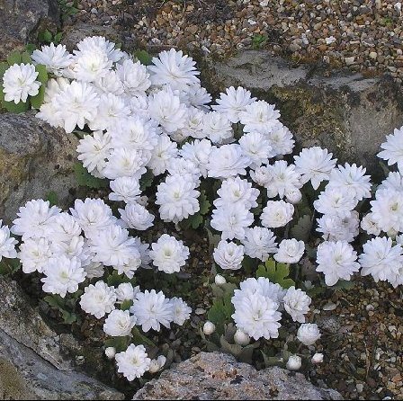 Звезда весеннего сада - сангвинария Флора Плена / Sanguinaria Flora Plena - имеет большие густомахровые роскошные цветки, похожие на кувшинки. Прелестные цветы сангвинарии распускаются ранней весной, на фоне лопастных сине-зеленых листьев. Это травянистый многолетник с корневищами красного цвета, которые и дали ему название. Сначала появляются бутоны, обернутые молодыми листочками. Потом раскрываются сами снежно-белые цветки диаметром 7-8 см, у них десятки узких лепестков, образующих полушаровидную форму. Сангвинария хорощо растет на рыхлой увлажненной почве, дренированной, в полутени листопадных деревьев. Летом растение находится в состоянии покоя, листья отмирают. Разрастается корневищами и зимует без проблем. Несомненно, это одно из самых красивых растений, цветущих рано весной!
